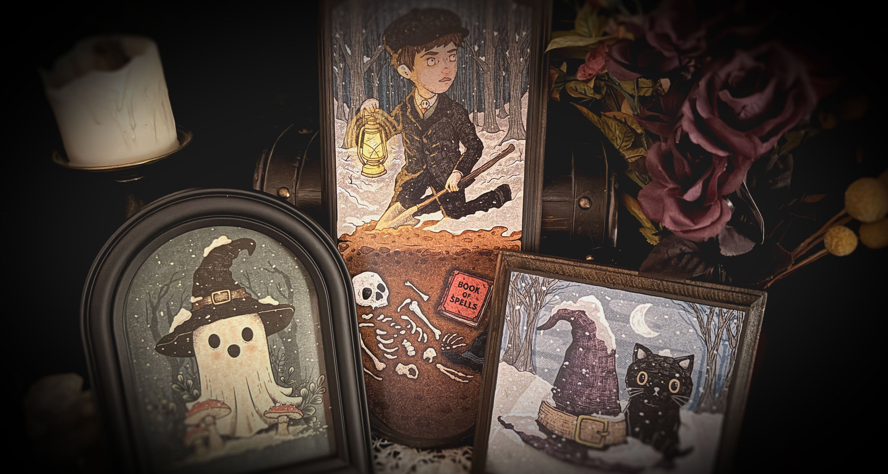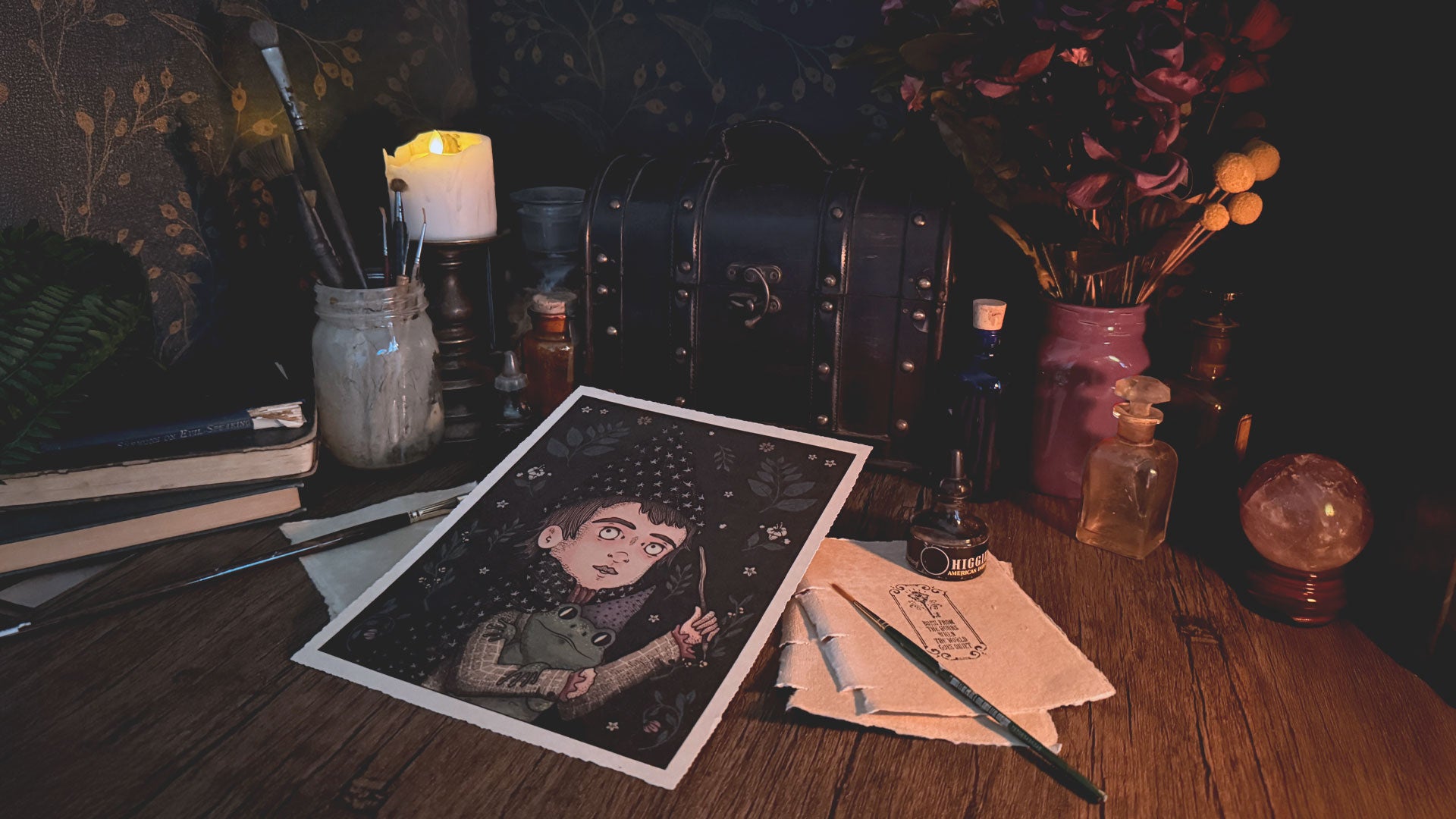 Midnight Conjurer is the culmination of all of Yosiell Lorenzo’s creative worlds, brought together under one name. It weaves the whimsical illustrations of The Orphans of Dudleytown, the fantasy-driven sculptures of Black Twig Forest, and the cozy, cottage-core designs of Haunted Abode into a single darkly enchanted vision.